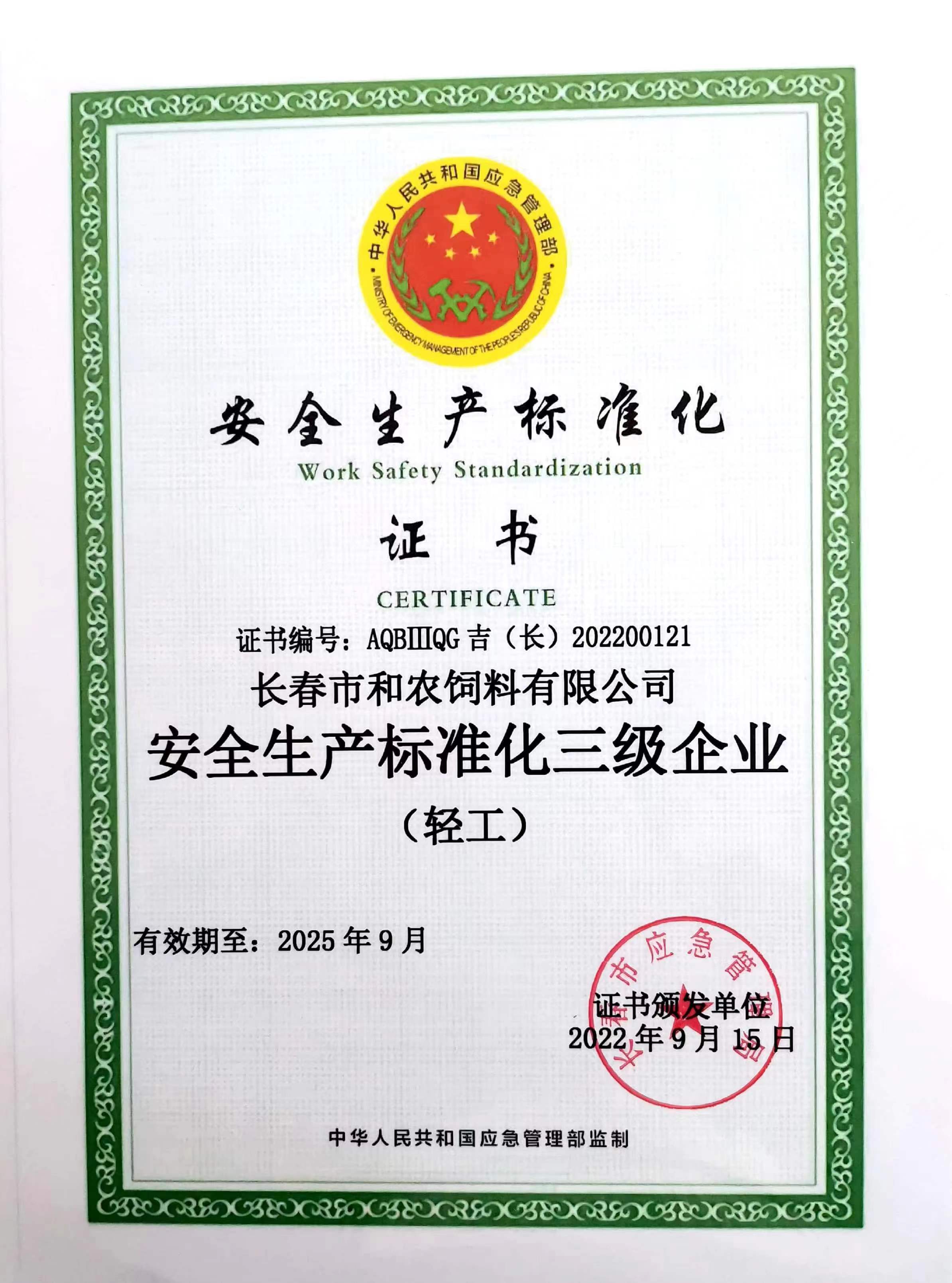 和農(nóng)牧業(yè)集團下屬公司 長春市和農(nóng)飼料有限公司榮獲由長春市應(yīng)急管理局頒發(fā)、中華人民共和國應(yīng)急管理部監(jiān)制的“安全生產(chǎn)標(biāo)準(zhǔn)化三級企業(yè)”證書,標(biāo)志著長春和農(nóng)飼料安全生產(chǎn)標(biāo)準(zhǔn)化建設(shè)邁上新臺階。